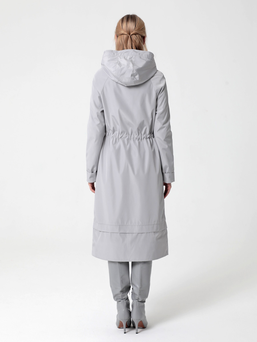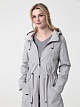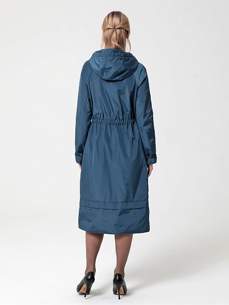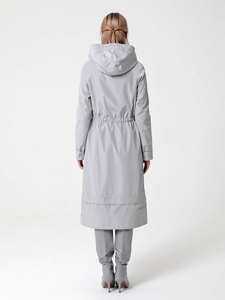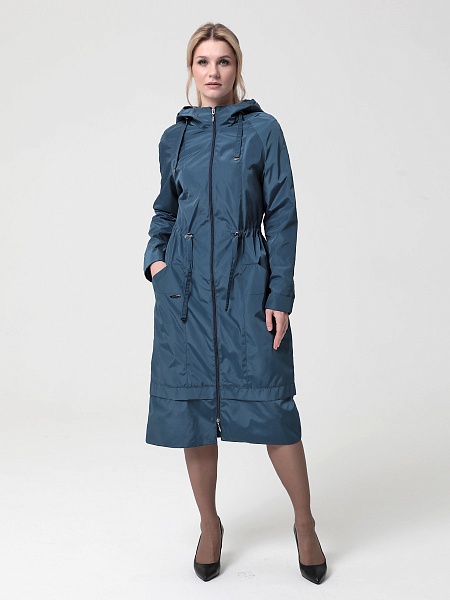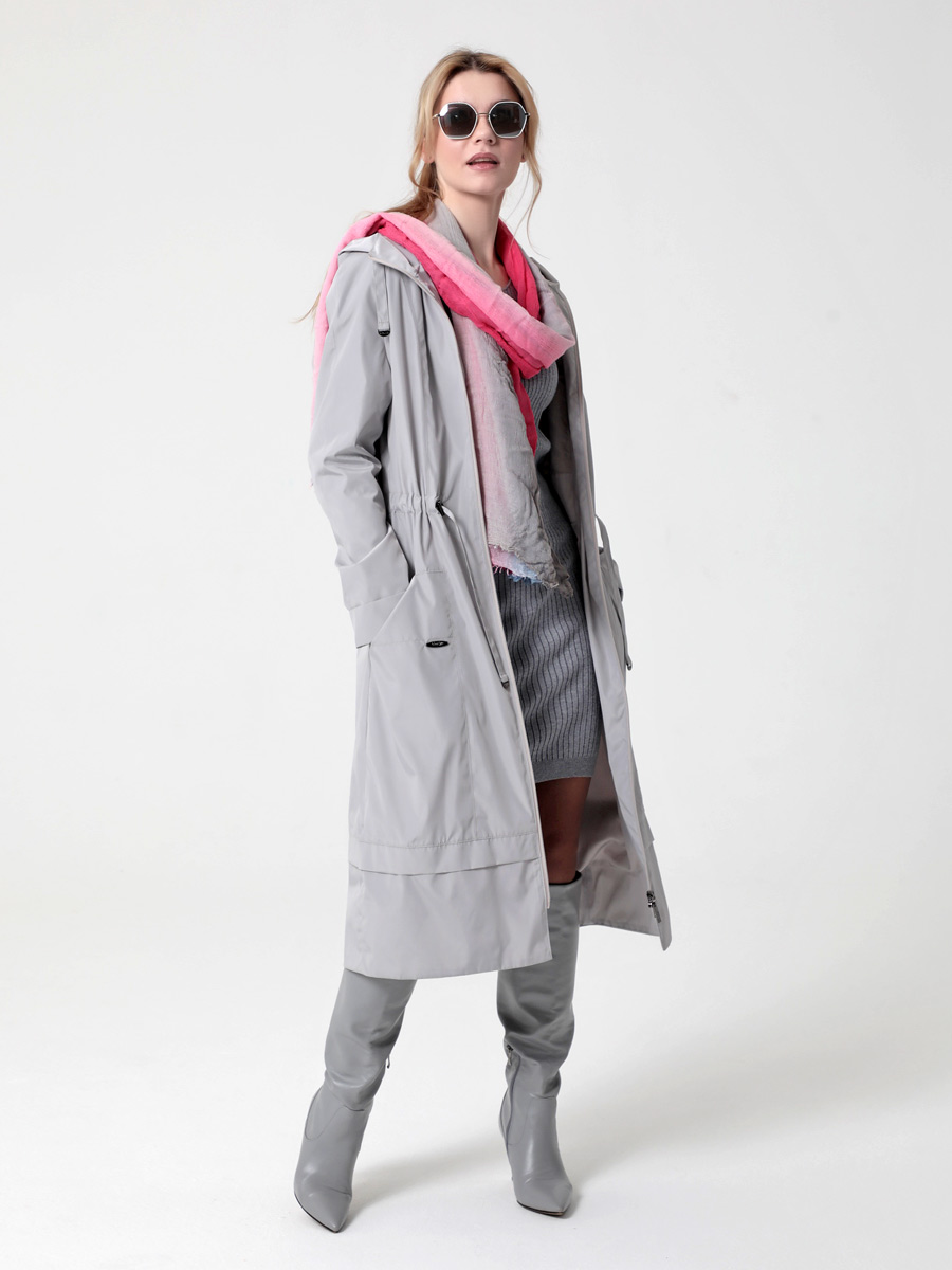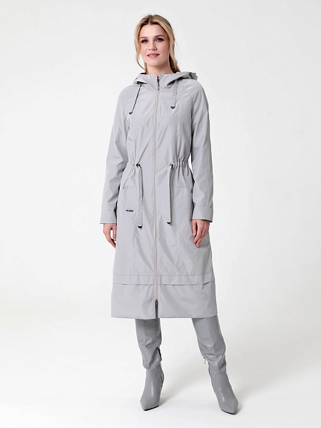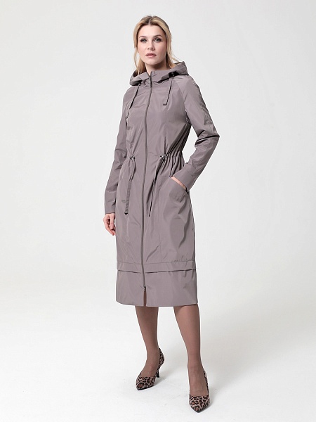 Длинный плащ прямого силуэта с рукавами покроя реглан и застежкой на двухзамковую молнию. Воротник - стойка, переходящая в капюшон. Многочисленные кулиски, большие карманы и легкая резинка по низу рукава - все эти детали подчеркивают спортивный стиль, актуальный в этом сезоне.