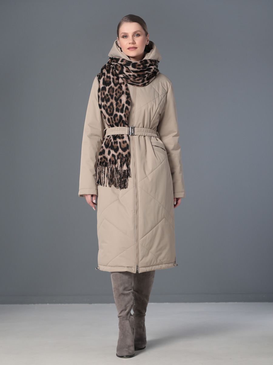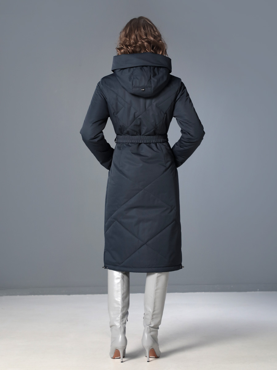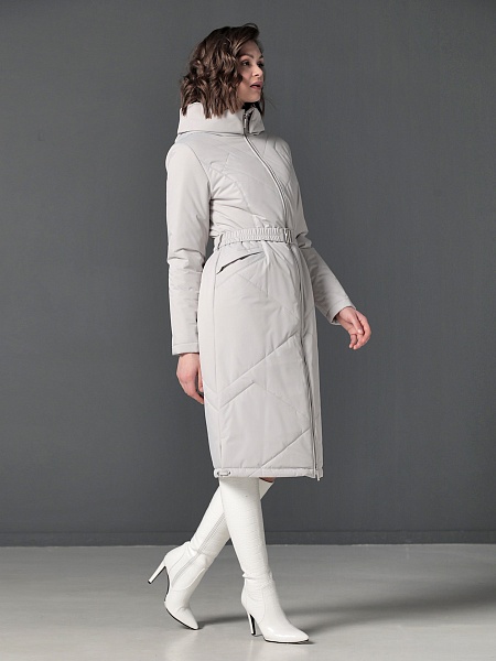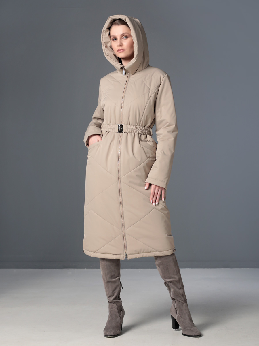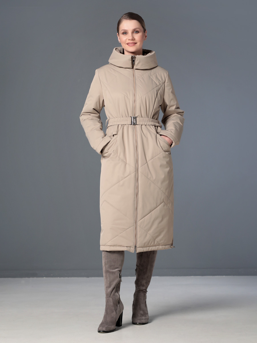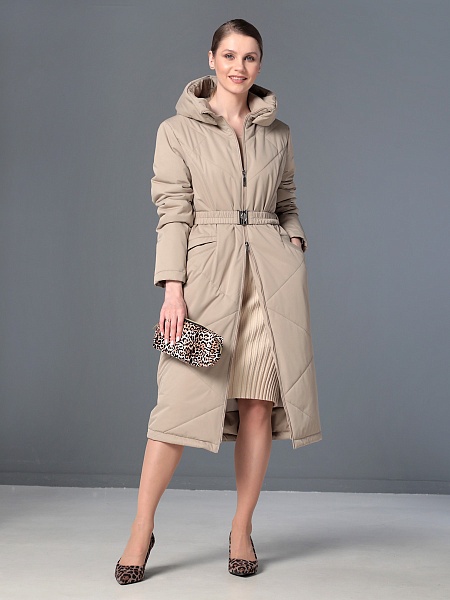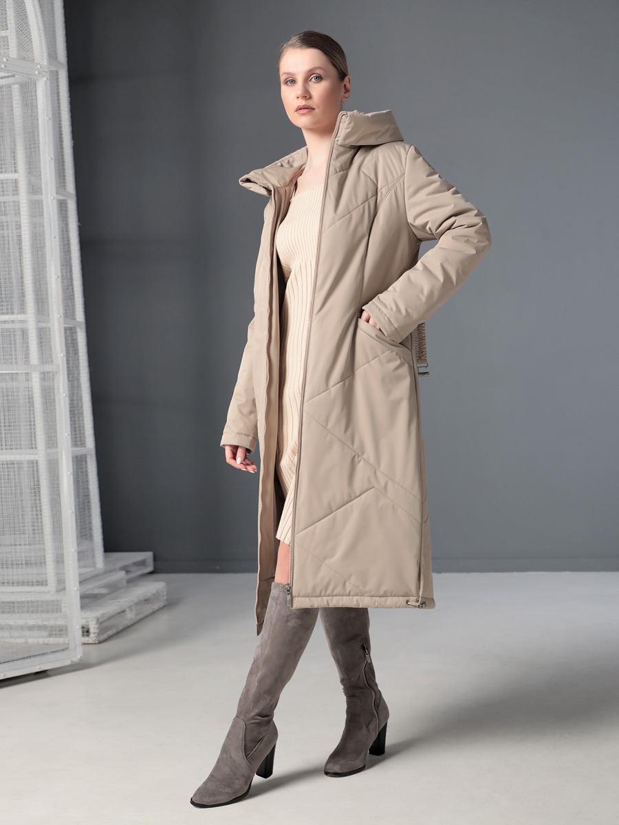 Длинное демисезонное пальто полуприлегающего силуэта с втачными рукавами и разрезами по бокам. Застежка на двухзамковую молнию позволяет расстегнуть пальто как сверху, так и снизу, что актуально при такой длине изделия для корректировки ширины шага и при подъеме по лестнице. Воротник - стойка, переходящая в капюшон. Прорезные карманы с декоративными лИсточками удобно расположены в рельефных швах. При желании линию талии можно акцентировать съемным эластичным поясом на защелке. Плащевая ткань имеет водоотталкивающую пропитку, которая выдержит небольшой осенний дождь или снег. Хорошо зарекомендовавший себя утеплитель Холлофайбер, плотностью 150 гр/м, защитит от холода и ветра. Подкладка в изделии выполнена из качественной ткани точно в цвет верха. Фантазируйте с аксессуарами, и Ваша осень будет стильной и комфортной!